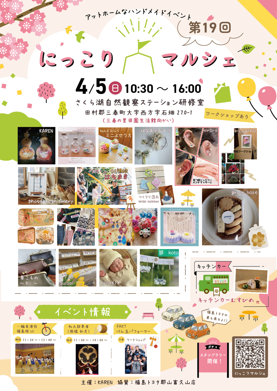 春の三春、梅・桃・桜が咲く季節に「にっこりマルシェ」を開催します。 会場では、手づくり作品やワークショップのほか、 福…