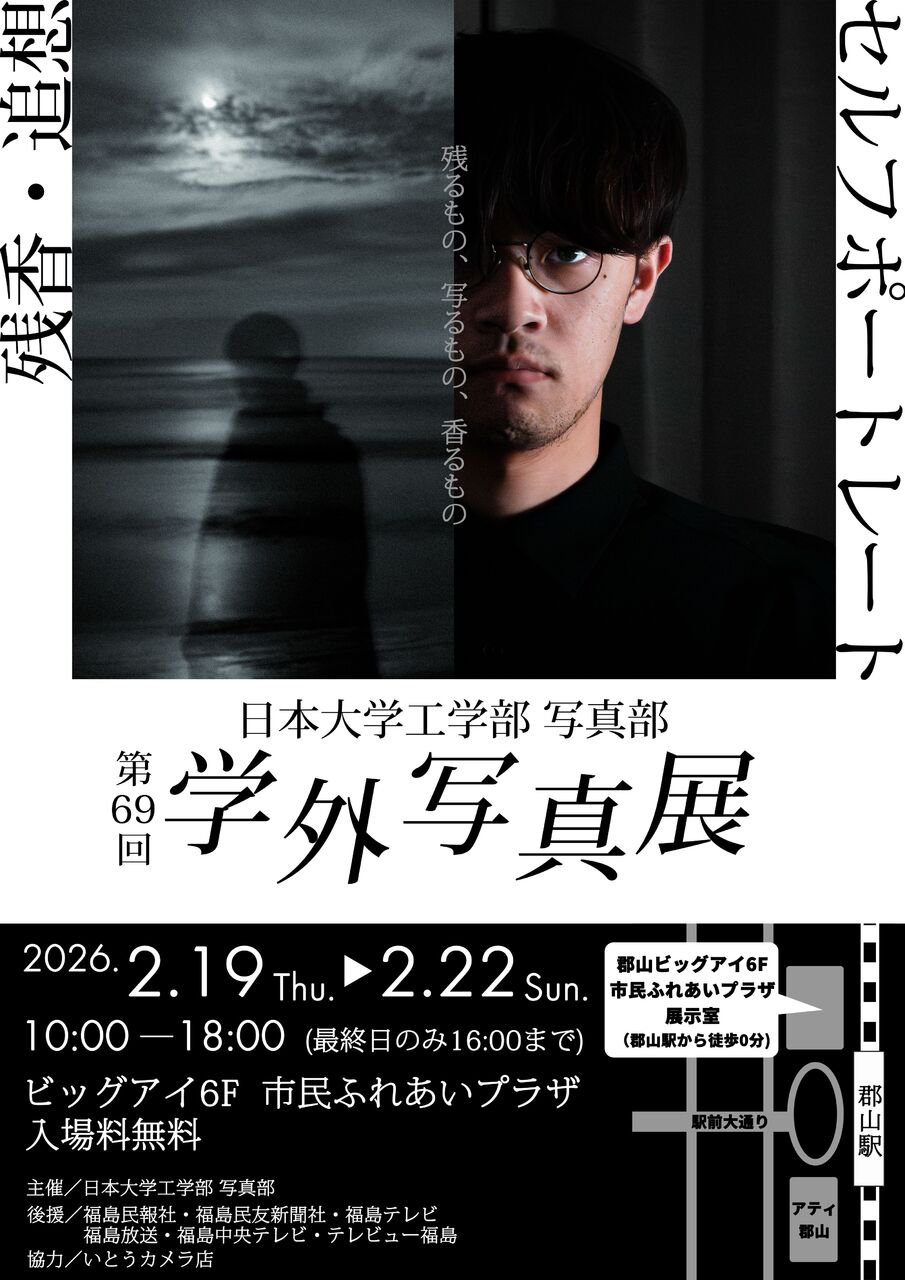 今年で69回目を迎える日本大学工学部写真部の学外写真展 今回はテーマ写真「残香・追想」・「セルフポートレート」とフリー…