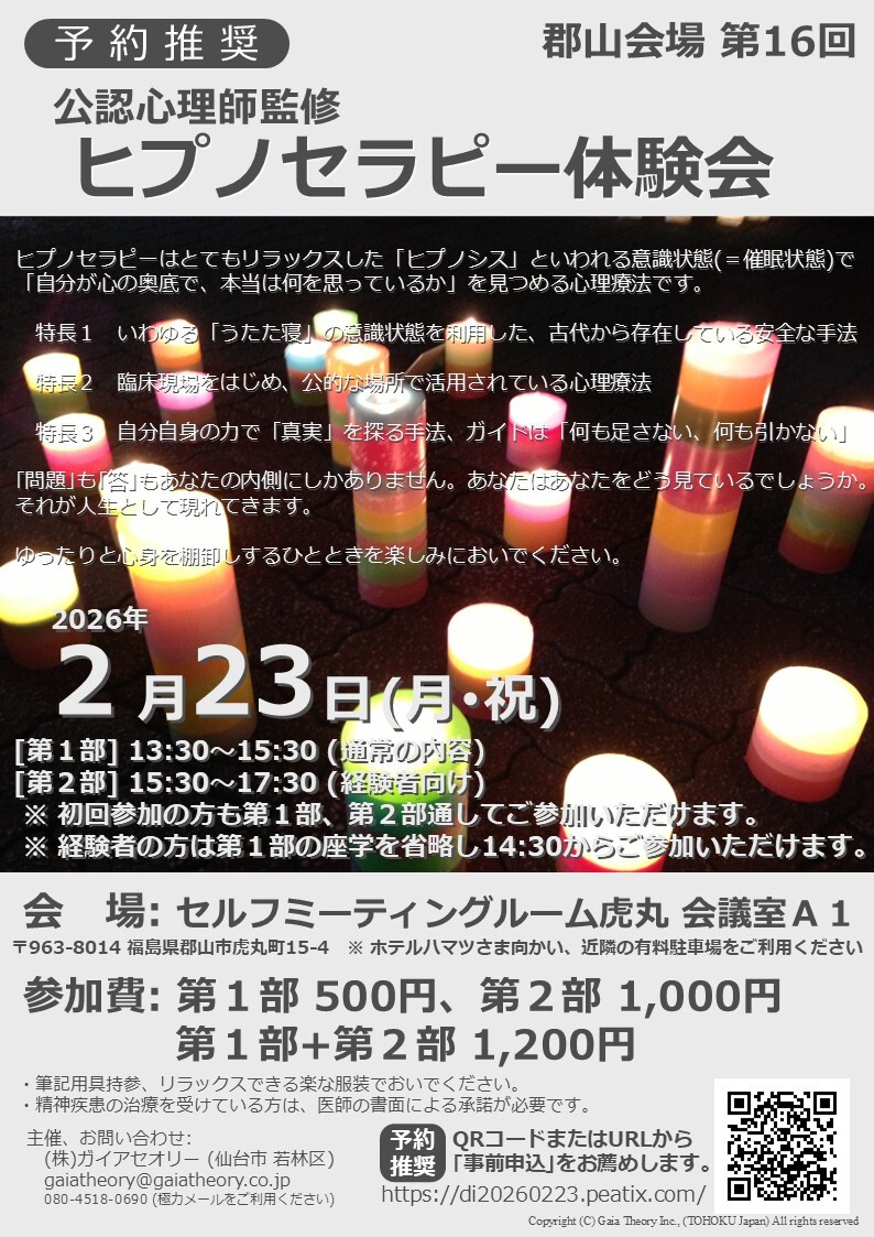 [公認心理師監修]第16回ヒプノセラピー体験会(福島県郡山市)