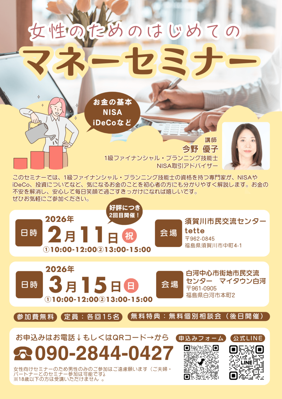 ★女性のための初めてのマネーセミナー★ お金の知識は、将来の安心や夢の実現のために欠かせない「一生もののスキル」です。…