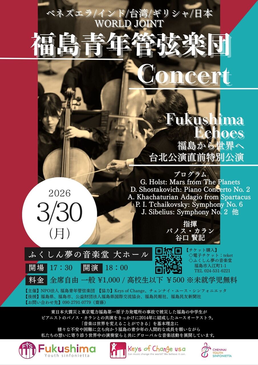 2026年4月2日に台湾で開催する「台北公演」直前の国内コンサートです。 福島と世界を音楽でつなぐ青年たちが「福島の響…