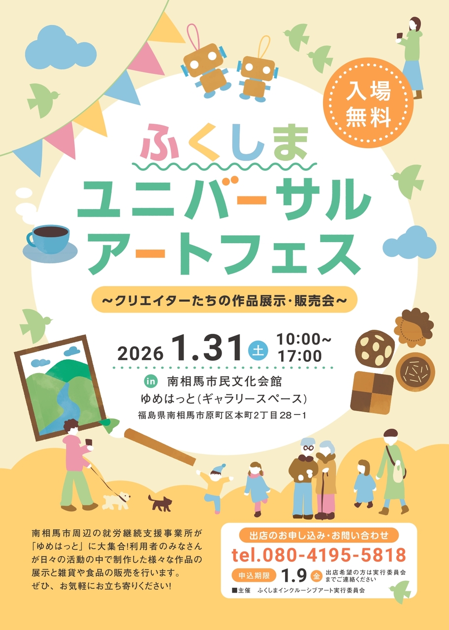 南相馬市周辺の就労継続支援B型事業所を利用する方々が作ったアート作品や食品を展示・販売いたします。 入場無料で1日限定…