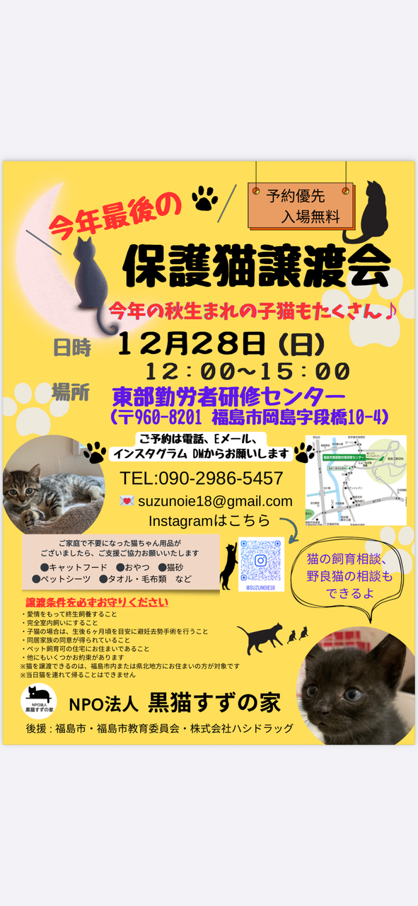 譲渡会開催のお知らせ 12/28(日) 「今年最後の保護猫譲渡会」を開催致します。 福島県県北地域で、様々な理由で保護…