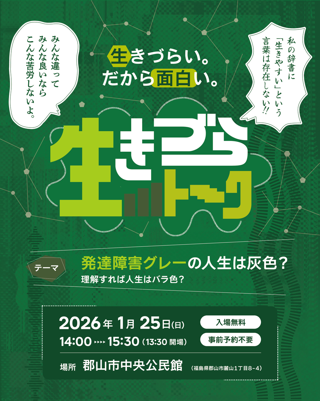 「生きづらい。だから面白い。」 生きづらさを楽しく捉えて明日からちょっと楽しく生きるためのトークイベント! 「発達障…