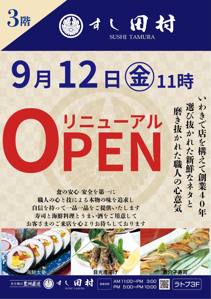 9月12日(金)『すし田村』として、リニューアルオープン。