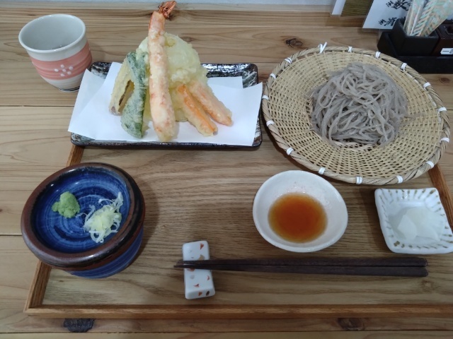 今日は夜勤明けで、そばが食べくなり、ここにお邪魔しました。このお店は20年以上前に出前で食べたことがありましたが、それ以降の利用です。到着時間は11時を少し過ぎた頃で、まだお客さんは居ませんでした。2人用のテーブルに案内されました。今回いただいたメニューは、大和セットざるそばです。ざるそばと海老が1尾と野菜の天ぷらが乗った天丼のセットです。天丼のタレは甘味があり私の好きな味付けです。タマネギの天ぷらが甘味があって美味しかったです。