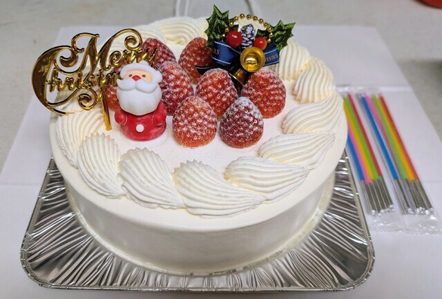 ちぇりちぇりの父が勤め先からパティスリーエソール様のクリスマスケーキを頂いて来ました。大きなケーキを家族で切り分けて幸せのひとときを過ごせることに感謝です。しっとりしたスポンジに生クリーム、苺の酸味が調和して美味しいです。サンタクロースの砂糖菓子が可愛いですね。ごちそうさまでした。
