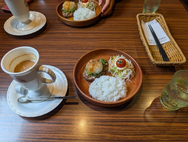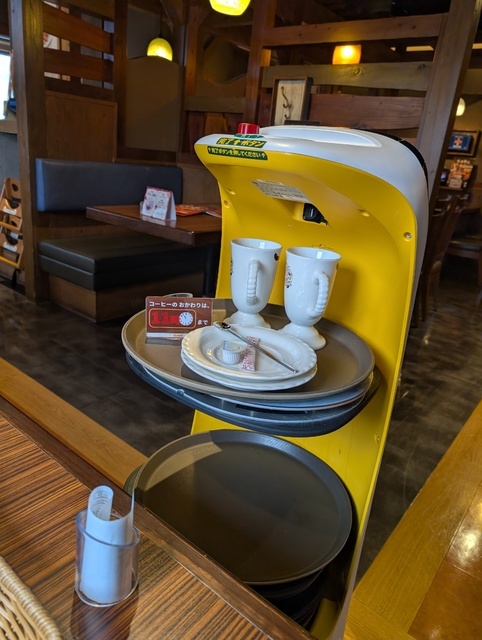 友達と10時前に入店するとお好きな席へどうぞと言って頂いて窓際の席に。10時からランチメニューも頼めます。11時まではモーニングメニューでコーヒーがおかわり自由なこともあり、ミニマルおろしディッシュセットの(みそ汁orドリンクのところで)シングルオリジンコーヒー(砂糖、ミルク付き)をタブレットで注文しました。少しして配膳ロボットがお届けしてくれました。見ていると道を譲り合ってお互いに通行しているので感心しました。メインのおろしバーグやシャキシャキサラダも美味しくてご飯が進みます。二杯目はブレンドコ―ヒ―をご馳走になりました。入口のお会計機にて、アプリの会員証を表示して、友達と別々にお会計をしました。スムーズでとても助かりますね。ありがとうございました。