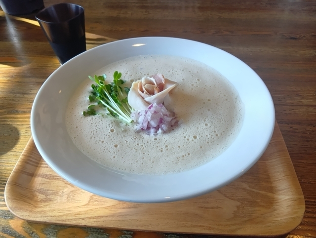 この歳になって斬新なラーメンの出会いがあった。スープの表面『泡』が浮かんでいる。メニュー名「泡鶏白湯 醤油ラーメン」。まずはスープからひとくち。泡と鶏白湯スープを一緒にすくって味わうと…。何だこれ、一気にスープの三分の一を飲んでしまったほどの美味さ。麺も薔薇の花みたいに盛り付けたチャーシューも申し分なく。凄いラーメンであった。