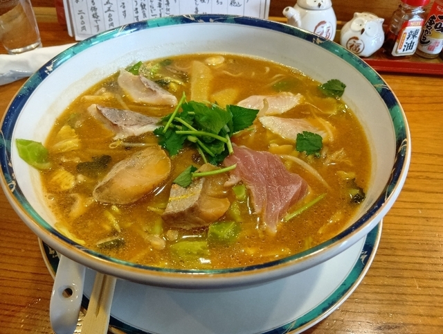 本日のお品書きの上部に「海の幸五目麺」が目に入り味噌味で注文。海鮮が入っているラーメンは割烹店らしく美味。おもしろく量も多くこれは満足満腹できる一杯であった。
