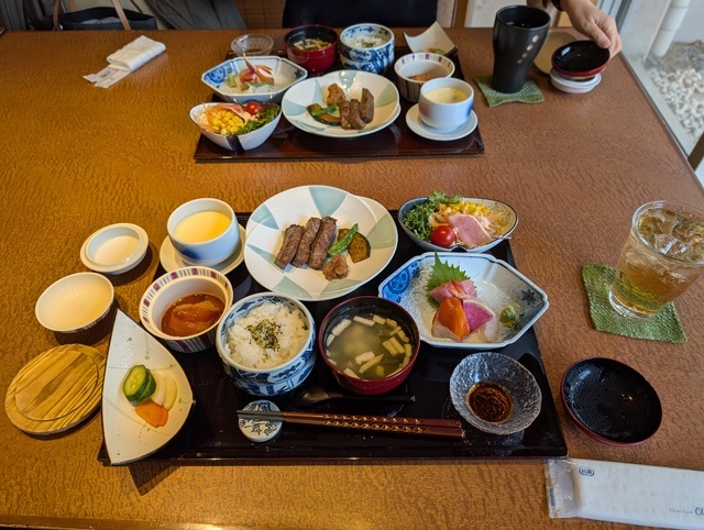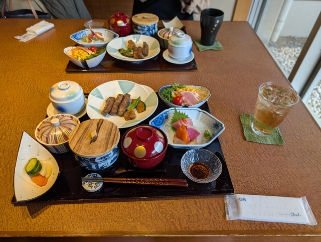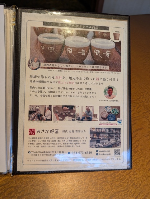 友達が予約を入れてくれて、「旬味キッチン風舞」様へランチに来ました。私はジンジャエール、友達はホットの烏龍茶を注文。配膳して頂くと、福島牛とご飯はあさか舞とご説明がありました。盛り付けも綺麗で、お肉は柔らかく、お刺身等とても美味しいです。食後にはピンク色の白玉ぜんざいでした。優しい甘さの粒あんとモチモチ食感の白玉をお茶と頂きました。メニュー表と一緒に、郡山コラボオリジナル名品として、「あさか野窯」様のオリジナル箸置きや湯呑みをやさしく振るとコロコロと鳴るとのご説明文が挟まれていました。拝読して堪能したり飲み終えた湯呑みを鳴らしてみました。季節によって外の景色を楽しみながら食事を楽しめるのも粋ですね。ご馳走様でした〜(*´ω`*) (投稿:2025/12/18 掲載:2025/12/19)