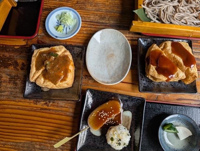 13時頃友達とランチに来ました。私は平日ランチセットにしました。ランチについている茄子の天ぷらはサクサクでかぼちゃの天ぷらはかぼちゃの甘みがあってホクホクで美味しい。また、ミニおにぎり、田楽等も付いていて嬉しいです。友達と三春三角揚げ【ピ―マン味噌】と【ゆず味噌】を注文して1個ずつ食べましたよ。蕎麦湯と温かいそば茶もご馳走様でした! (投稿:2025/09/25 掲載:2025/09/29)