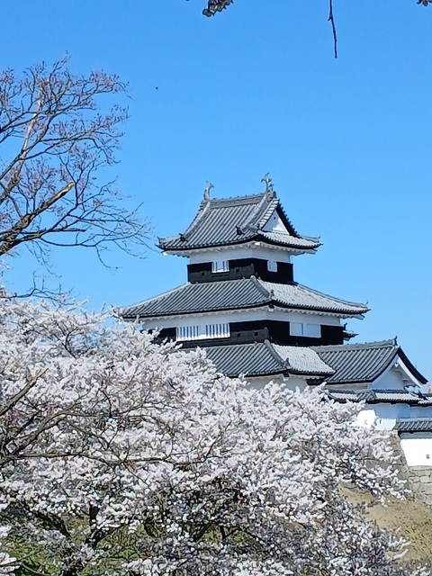 今日は、4月8日(水)の平日です。インターネットでこちらのお城を知り、お城と桜を考えたら、この日と決めて見に来ました。ところが、いざ駐車場に来て見ると、平日なのに満車で、空きが出るのをしばらく待っていました。無事駐車場に入れて、城の周りを歩いていても、桜は満開で、新小学生の写真を、桜とお城をバックに撮っていました。それにしても、天気が良く青空の下、お城と桜は、とてつもない完璧なコンビネーションを見せてくれました。これは、本当に感謝しかありませんでした。ありがとうございました。 (投稿:2026/04/09 掲載:2026/04/09)
