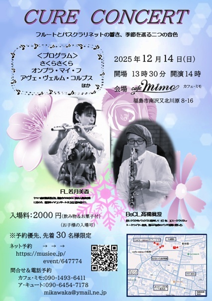 お子様の入場も可能です。 ご予約は、予約サイト、 またはカフェ・ミモや主催者への電話・メールにて受け付けております。 |