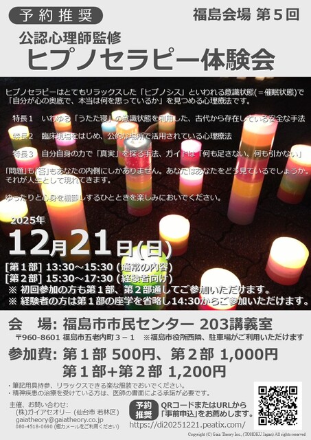 [公認心理師監修]第4回ヒプノセラピー体験会(福島県福島市)
