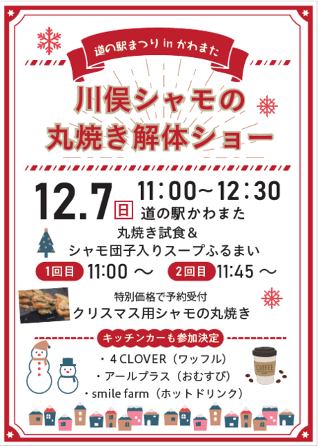 川俣町の特産品であり、福島県認証ブランド地鶏でもある「川俣シャモ」の丸焼き解体ショーが開催されます。もれなく試食も出来ますので、是非お越しください。