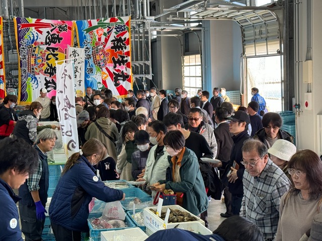 年末の風物詩「請戸魚市」では、活魚や水産加工品等の海産物が販売されます。購入者だけの特典(ホッキ飯やカニ汁の無料配布)もありますので、ぜひお越しください。