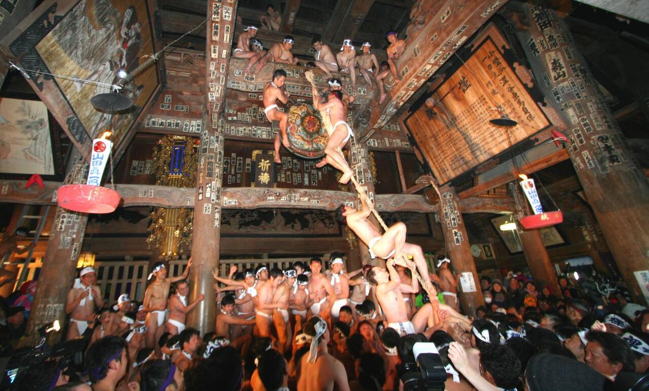 こうこうと燃えるかがり火の中、大鐘を合図に雪の中下帯一つの男たちが菊光堂の大鰐口を目指す姿は勇ましく、見る人を魅了します。
