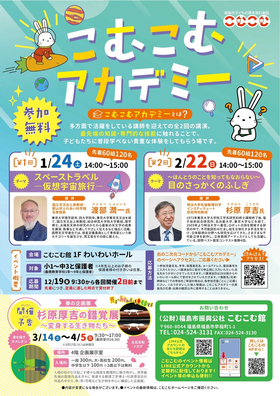 こむこむホームページからご応募ください。先着につき、定員になり次第受付終了です。 各回60組120名 対象は小1~中3のお子様と保護者 参加費無料 |