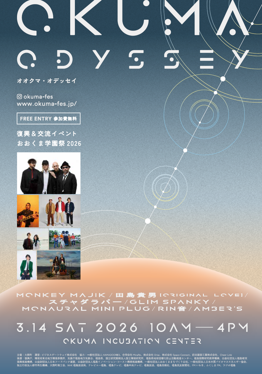 昨年度に続き、音楽プロデューサーの小林武史氏を総合プロデューサーに迎え、音楽・アート・食を取り入れた大熊町復興&交流イベントおおくま学園祭2026「OKUMA ODYSSEY」を2026年3月14日(土)に大熊インキュベーションセンターにて開催!年に一度、3000人規模の大イベント!エネルギー関連企業の出店や展示、ワークショップ等の様々なコンテンツが盛り沢山!