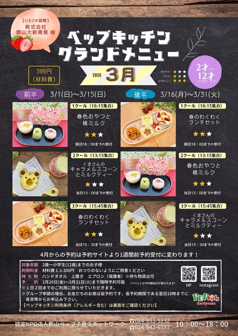 ペップキッズでお料理体験 <3月グランドメニュー> 3月前半 3/1(日)~3/15(日) 【第1クール 10:15…