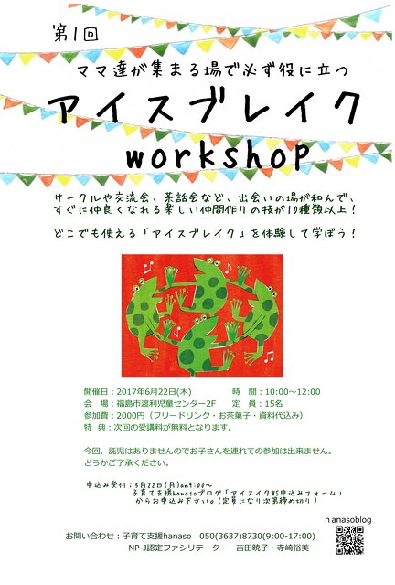 サークルや交流会などで集まった人を和ませ、コミニュケーションを取りやすい雰囲気を作るための手法です。主にママ達が集まる…