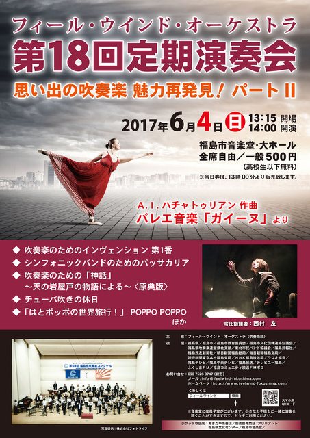 福島市を拠点に活動するフィール・ウインド・オーケストラの第18回定期演奏会のご案内です。 「思い出の吹奏楽 魅力再発見…