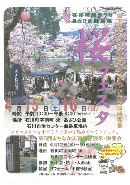 桜まつりと、まちなか工房作品展示・販売会の同時開催! ひとつひとつを手作りで真心を込めて作りました。 【石川町桜まつ…
