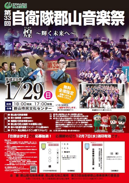 郡山駐屯地では「煌 ~輝く未来へ~」をテーマに迫力ある演奏、演技、演舞を行います。 ・出演 郡山駐屯地音楽隊、第…