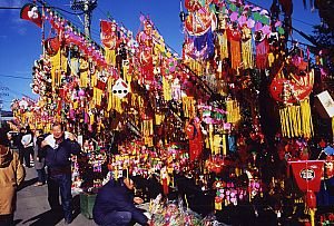 恒例の初市。起上り小法師や風車など縁起物を買い求める人で賑わう。