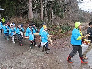 法用寺仁王門に飾られた藁の蛇をおろし、雀林集落の小中学生が抱えて鬨の声を上げながら集落内を回ります。