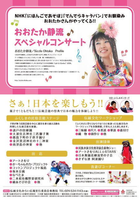 福島の民俗芸能(国、県、市指定無形文化遺産)ステージに加えて様々な日本の伝統文化・芸能が一堂に会したお祭り。日本舞踊、…