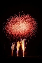 打ち上げ花火とともに、キャラクターの大型灯ろうや先祖の霊を慰める小型灯ろうを流します。空と川とのきらめく火の競演は見る…