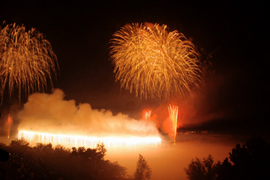 奥会津最大の花火大会。毎年8月10日、夕闇迫る只見川に灯籠が静かに流れ、夜空と水面に咲く迫力ある花火が幻想的な世界を作…