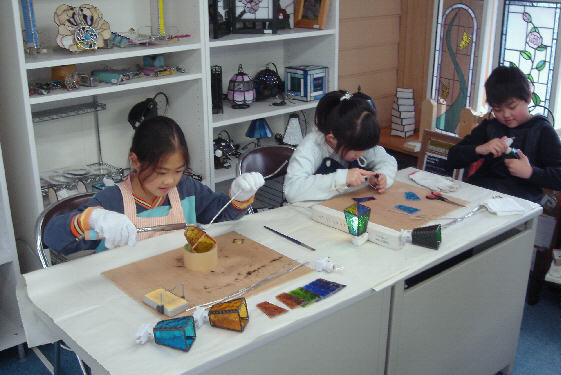お休みランプや写真立てなど、カット済みのガラスに銅テープを巻いて、ハンダ付けして、本格的なステンドグラス作品を作りまし…