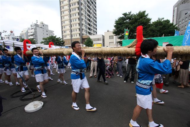 初日の大わらじ奉納の後は、名物わらじ踊りがコース内を華やかに演出します。日が暮れてからはラップ風にアレンジされたわらじ…