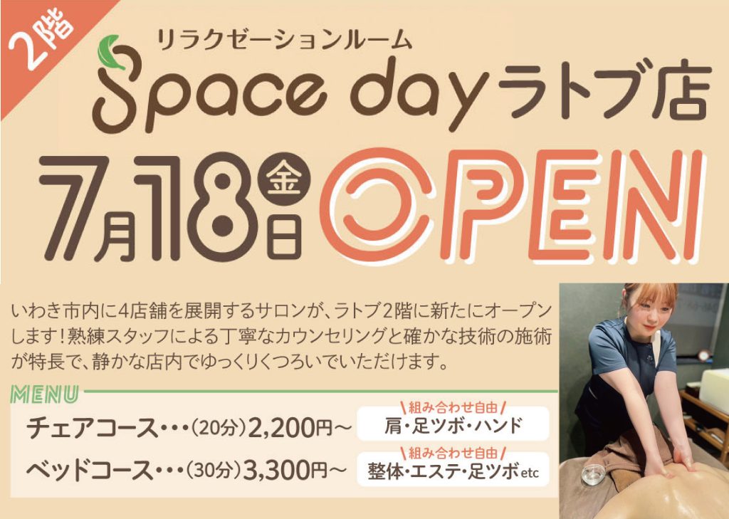 7月18日(金)2階に「リラクゼーションルーム スペースデイ」OPEN!!