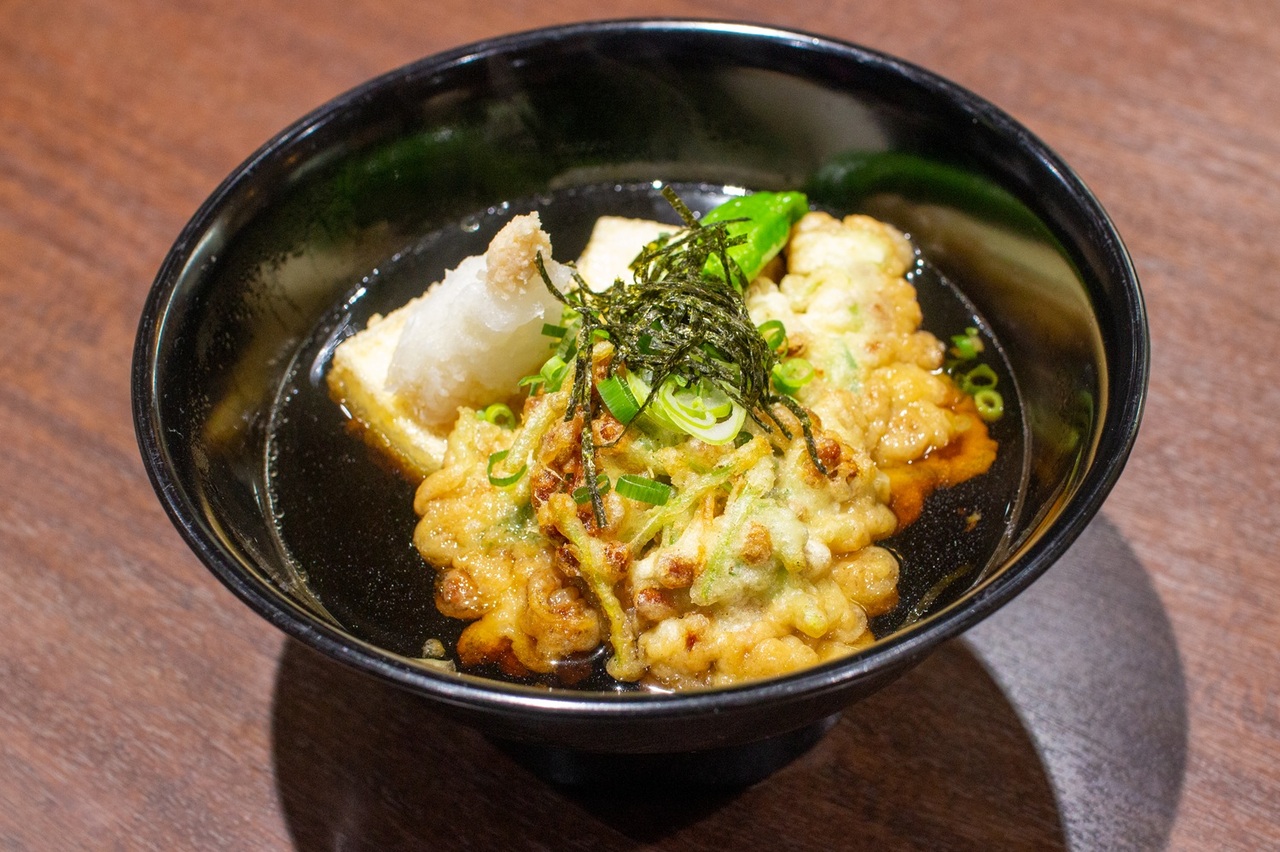 とあるコンテストがきっかけで生まれたというこちらのメニュー!熱々の天つゆに大根おろし、生姜、ネギ、海苔などの薬味と、香ばしい納豆がよく合うんです。酒の肴としてはもちろん、お食事としてもオススメ。今の季節は辛口の日本酒を熱燗で合わせるのも◎
