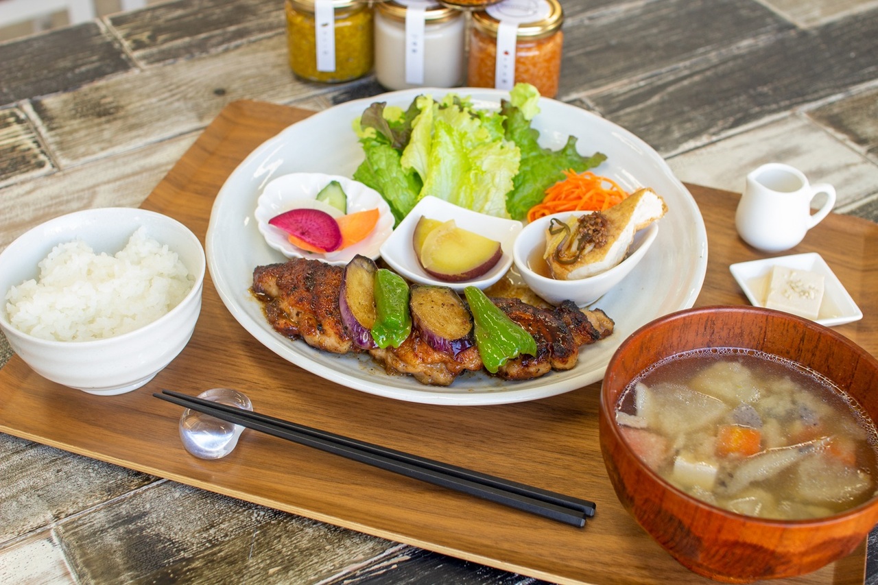 発酵食品ソムリエのいるお店「ナックルズカフェ」。 地元産の米や野菜を中心に、麹や漬物などの発酵食品を使用したこだわりランチを提供しています。こちらのメニューでは、塩麹に一晩漬け込んだ鶏肉の柔らかさに感動すること間違いなし!付け合わせも含め発酵食品三昧で美しく健康に♪