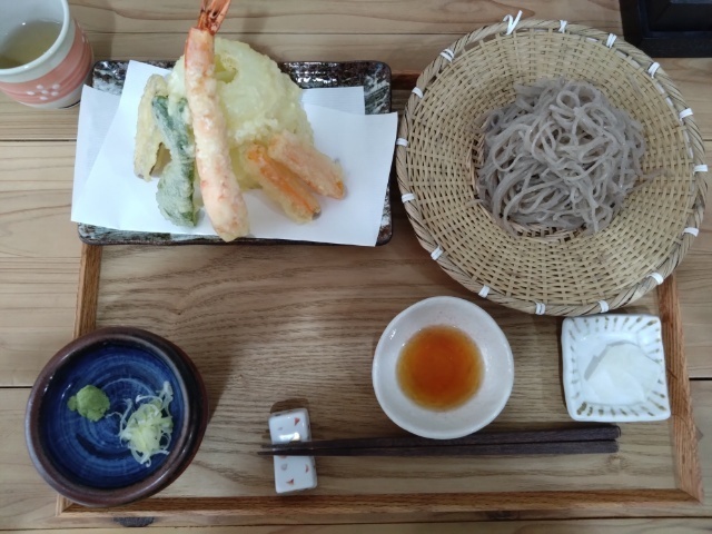 今日は夜勤明けで、そばが食べくなり、ここにお邪魔しました。このお店は20年以上前に出前で食べたことがありましたが、それ以降の利用です。到着時間は11時を少し過ぎた頃で、まだお客さんは居ませんでした。2人用のテーブルに案内されました。今回いただいたメニューは、大和セットざるそばです。ざるそばと海老が1尾と野菜の天ぷらが乗った天丼のセットです。天丼のタレは甘味があり私の好きな味付けです。タマネギの天ぷらが甘味があって美味しかったです。
