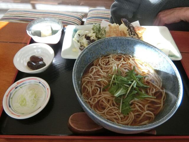 今日はヨークパーク近くにある病院での定期の診察日。診察終了後なマッサージをしてもらい、買い物目的の須賀川へ。そこでいか人参と白菜キムチ、イカの刺し身を買い、興味をそそる口コミのあったここに来ました。訪問時間は11時15分です。すでに数組のお客さんがテーブルについテーブルに着いていました。今回も1人なので、カウンターに案内されました。本日 いただいたメニューは十割そば(ミニ天ぷら付)です。注文から5分くらいでそばの到着です。十割そばは、独特の味と旨さがありました。天ぷらは、少ないなと思っていましたが、食べているとちょうどいい量でした。つけ汁には辛味大根か生わさびが選べたので、生わさびでいただきました。おろしたてのわさびはとても美味しかったです。