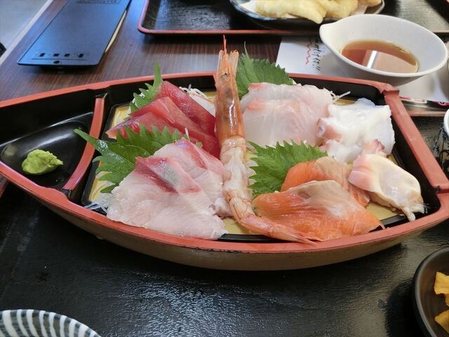 今日は相馬方面にお出かけです。松川浦に到着したのが13時頃です。せっかくここまで来たので、人気のお店たこ八で食事をしようと思いやってきました。しかしさすが人気店、お店の前には順番待ちの行列がありました。しかしそれにも負けず順番待ちに名前を連ねました。この時点で11組待ちでした。しばらく待ち、14時過ぎに順番がきました。今回いただいたメニューは、刺し身定食と単品でヤリイカの天ぷらにご飯と味噌汁を付けての注文です。その他にホッキ貝の天ぷらもお願いしました。注文から10分くらいで御膳の到着です。刺し身は、マグロとハマチ、サーモンに鯛、そして水ダコとホッキ貝です。それぞれのネタは大きくて厚みがありました。ヤリイカもとても美味しくいただきました。ホッキ貝の天ぷらもいい味でしたよ。