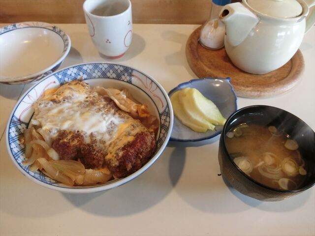 いままで気になりながらも素通りしていたお店でした。「東京まん」と言えばもう廃業してしまったとんかつの老舗です。名前だけなのかそれとも系列店なのか気になっていたので、今日伺ってきました。訪問時間は11時10分頃です。まだお客さんは居なく私1人でした。今回いただいたメニューは、煮込みカツ丼です。注文から15分くらいで着丼しました。1.5cm位ある厚めのカツは臭みもなく旨みが詰まっています。味付けも自分好みの味。豆腐とワカメの味噌汁に自家製のたくあんが付いています。たくあんは大根の味と干し大根の歯応えがとっても良かったです。東京まんとの関係が気になり意を決して聞くと、駅前にあった東京まんで働いていた人がここに店を出したと言うことでした。どうりで美味しいわけです。