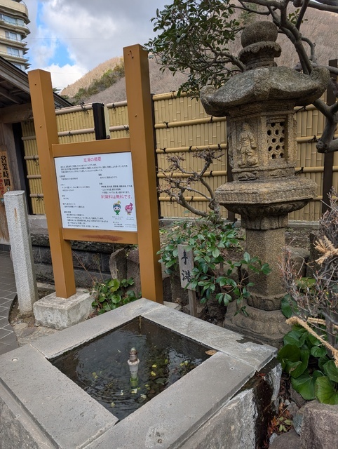 友達と足湯へ浸かりに来ました。手湯もあり、楽しいです。タオルを持参して、ゆっくり浸かりました。底には不揃いな石が埋め込まれていて、適度な指圧になります。外気は冷たいですが、利用した後は足だけではなく、全身の血行が良くなったようでぽかぽかしています。足湯効果は持続するようですね。ありがとうございます。