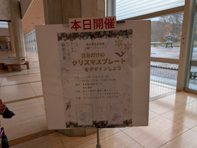 「巨匠ハインツヴェルナーの描いた物語(メルヘン)現代マイセンの磁器芸術」へ車椅子の娘とお伺いしました。「ふくしまアートスタンプラリー」参加中でスタンプを取得して嬉しい。この日は公開ワークショップで「自分だけのクリスマスプレートをデザインしよう」とのことで、皆様でグリーティングカードを楽しく作成中でした。私達親子は時間が過ぎていましたので、後で少しお邪魔したところ「お家で見本を見て絵の具等で是非作ってみてくださいね。」と、用紙を頂きました。本展ではマイセン磁器の歴史と共に、マイセン磁器を支えたひとりの絵付師のハインツ・ヴェルナー氏の世界を堪能しました。撮影OKのスポットもありましたよ。2階常設展はイヤホン等を利用してスマホから音声ガイドを利用できるのそうなので素晴らしいですね。 只今「第17回風土記の丘」郡山市内の美術部による作品展が開催中です。実力派揃いの作品群にキュンキュンしました。ありがとうございます。