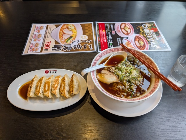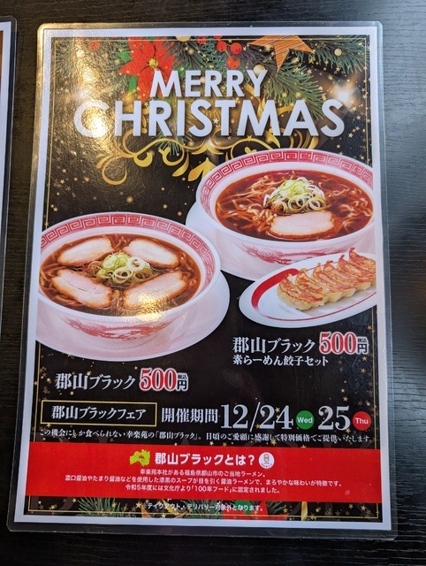 SNSで郡山ブラックフェアのお知らせを受けて、楽しみにしていました。クリスマスの24、25日の2日間はワンコインでご提供とのこと。私は「郡山ブラック素らーめん餃子セット」をタブレットの画面から注文しました。郡山ブラック素らーめんのスープは熱々で濃すぎず絶妙な味わいです。これまた熱々の餃子を酢と醤油、ラー油に浸けて頂きました。美味しくて幸せ〜。素敵なクリスマスイブになりました。