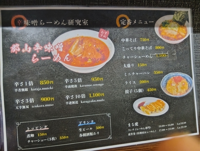 郡山辛味噌ラーメンを提供しているのを聞きつけて昼食時に入店してみた。…といっても実は辛い物が苦手。辛さ1倍・3倍・5倍・10倍とあるが迷うことなく1倍で注文。ひとくち目、ヤバイ辛い、無理かも。3口目には辛いのが慣れて美味さに変換。それから麺と具も手をつけて美味しく頂けた。