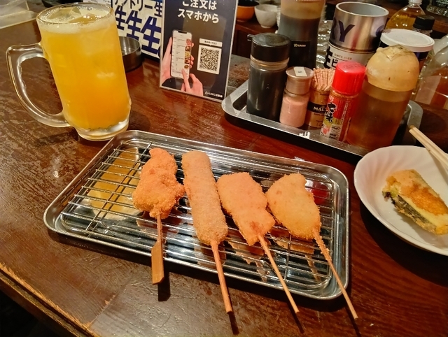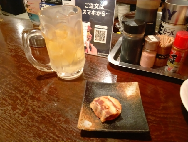 次のバス時間が結構あるので入店してみた。何種類もあるハイボールのネーミングが面白い。1杯目は「代官ハイボール」2杯目「陣屋ハイボール」。つまみはお通しとおまかせ串揚げ5本盛。時間を気にしながら美味しく頂いた。ハイボールに合いそうなメニューもあったので今度飲み友達とゆっくりとお邪魔したいと思う。