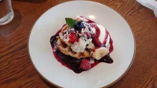 2度目の来店。祝日のお昼時だったので前回よりも店内は賑やかでした。今回はランチ目的!!だったので私は週替わりワンプレートランチを。主人は魚介の明太子パスタを注文。ワンプレートランチはサラダ、メイン、ライスが盛られたヘルシーなランチでした。パスタはボリュームもあり、主人も満足そう。今回もやはりデザートにも手を伸ばしてしまいました。前回から気になっていた「焼きワッフルのバニラアイス添え」を注文。パンケーキよりも量は少なめですが、ブルーベリーとチョコレートの二種類のソースがたまりませんでした! (投稿:2014/07/21 掲載:2014/07/24)