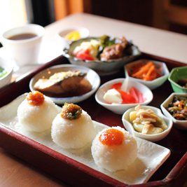 ちょこんと三つ並んだおにぎりセット。小鉢がたくさんが、うれしい。